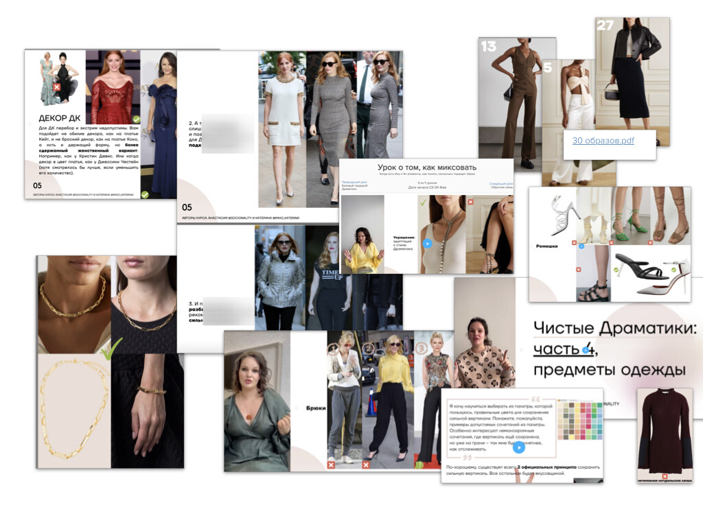 Домашки - это очень хорошая штука, заставляет шевелитьть мозгами. И теперь это уже не просто абстрактные картинки и слова, а понимание взаимосвязей и эффектов. Теперь этим всем действительно можно пользоваться, именно встраивать в свою жизнь, а не носить некий чуждый образ из рекомендаций. Ну и девочки на курсе с похожими болями - бесценно. Это очень хорошо помогает, оказаться в "своей" среде, когда несколько человек ломают голову или ищут примеры одного и того же. Потому что там показаны конкретные вещи и эти вещи собраны в образы - лично для меня это намноооого удобнее, чем лукбук.
